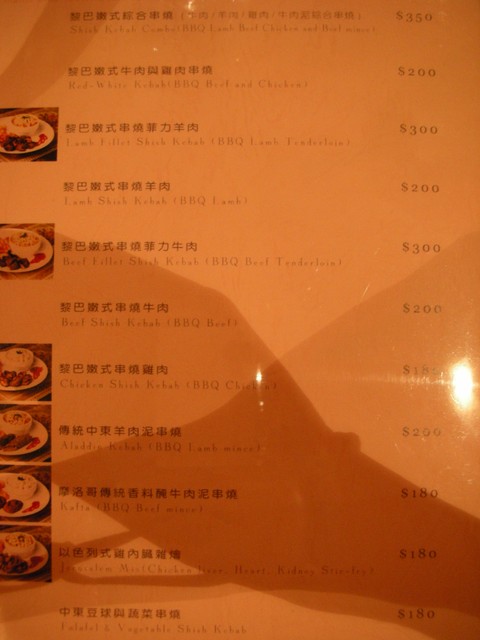 菜單上主要有黎巴嫩式、以色列式、摩洛哥式以及中東菜