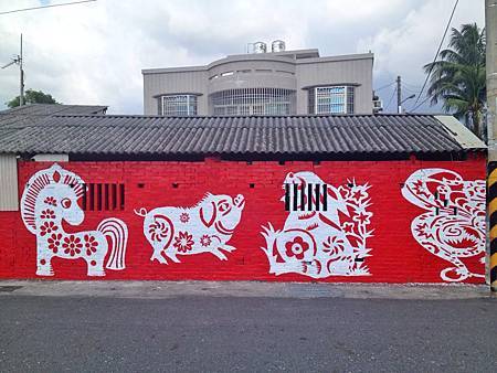 在朝臺南玉井吃芒果的途中,經過善化一帶,就繞過去尋找這個近期新興的「胡厝里」彩繪村。鄉下農村仍多保有合院的建築形式,在「埕」外有一道矮磚牆,歷經風霜的矮磚牆就變成了彩繪的素材。雖然為老舊外牆漆上各式各樣圖案的彩繪,早已不是什麼新鮮事,但是當社區中有彩繪牆聚集時,就會默默地吸引遊客前來參觀。